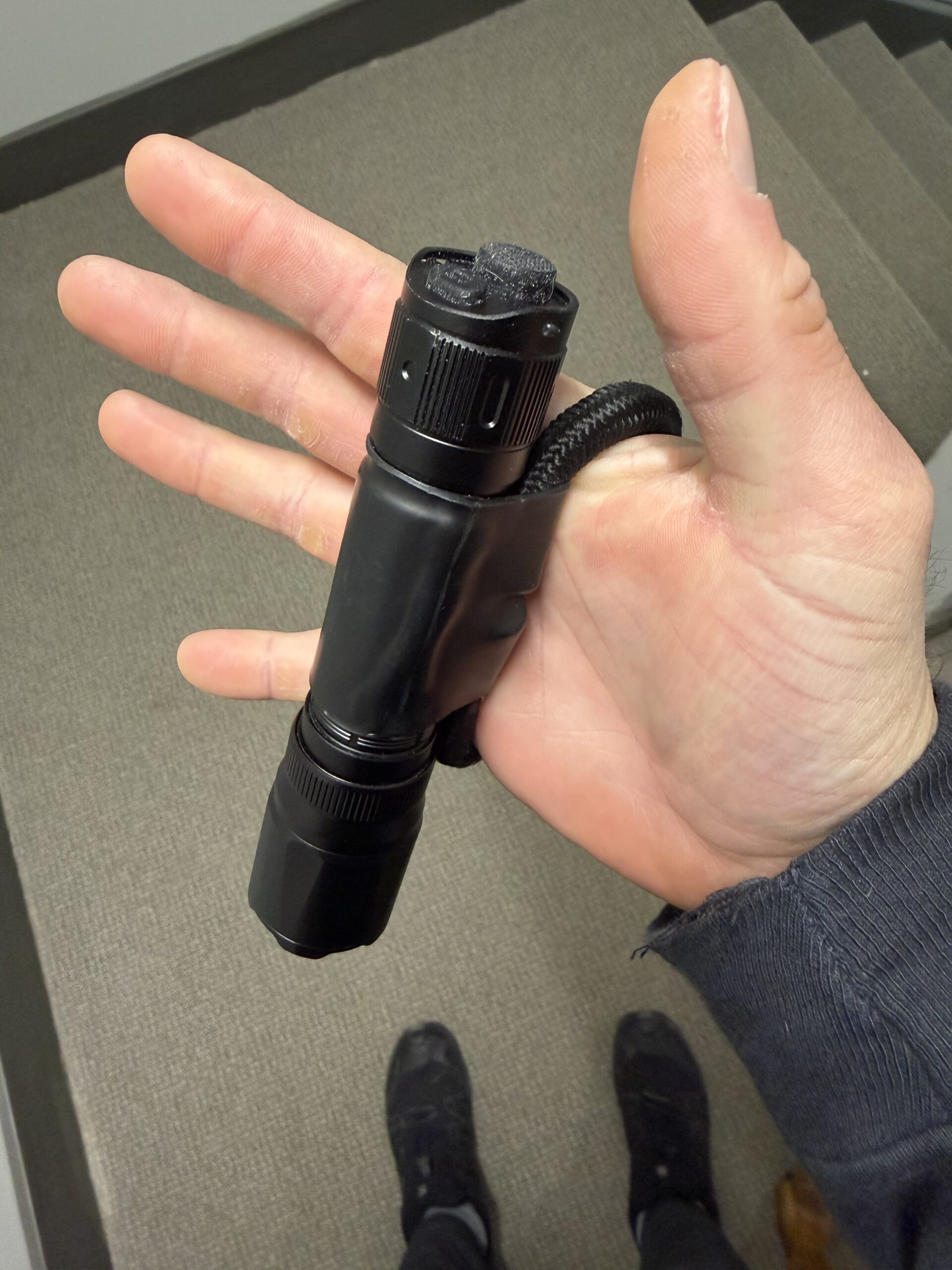 Tools? I made a note to myself to never leave baggage claim without my fixed blade again. Learn from your mistakes. Shortly after I snapped a picture of the shark and prior to him relocating I decided I needed a tool. I discreetly removed my EDC Fenix PD35R 1700 lumen flashlight from my right pant pocket and bungeed it to my right hand inside my right jacket pocket. My thumb was staged on the strobe button, careful not to accidentally discharge it and giveaway the hidden tool. Surprise, speed, violence of action. I knew had he approached us and escalated his behavior from loitering to any verbal/physical contact or threatening preemptive posturing, I was to bleach him in the eyes with the strobe as I struck him with a hammer fist in the orbital and maxilla with the tip of my light and go into head control to a takedown if a limb wasn’t available for me to access post ballistics.